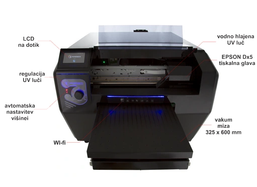 Sam tiskalnik sicer meri 930 mm v dolžino, 740 mm v širino in 530 mm v višino. Tiska do resolucije 5760 x 1440 dpi, kar omogoča resnično kvaliteten odtis. Maksimalna velikost tiska je 300 x 500 milimetrov. Z njim lahko potiskate vžigalnike, koledarje, pisala, rokovnike, dežnike, nalepke, usnje, aluminij, steklo, plastiko, les … Omogoča tudi UV DTF tisk nalepk. Opremljen je z 8-barvno Epson DX5 tiskalno glavo (CMYK + 2-krat bela + 2-krat sijaj lak opcijsko po želji pa lahko 4 bele namesto laka), ima regulacijo moči UV led luči, ki je vodno hlajena za daljšo življenjsko dobo … Tiskalnik vse barve samodejno pretresa (te funkcije nima nihče od konkurence), obenem pa poskrbi za kroženje bele barve, tako da ni težav z mašenjem tiskalne glave in dosegom optimalnega učinka … Višina tiskanja se nastavi samodejno. Pri višini predmeta, ki ga želite potiskati, ste omejeni na 130 milimetrov. Poskrbeli smo tudi za enostavno upravljanje, saj se zavedamo, da je danes uporabniška izkušnja tista, ki šteje dvojno. Zato smo tiskalnik opremili z LCD zaslonom na dotik, meni pa je na voljo v slovenskem, hrvaškem in angleškem jeziku. Dokupite lahko razne nastavke, ki vam omogočajo tisk na ovalne predmete, nosilne vrečke, koledarje … S povezljivostjo ne boste imeli težav, saj je tiskalnik UV led TT system 3050 opremljen tudi z Wi-Fi, mrežno in USB povezavo. Katero boste izbrali, je torej samo vaša odločitev, možnosti pa kar nekaj. Tiskalnik ko ga ne uporabljate je lahko ugasnjen in ne troši barve ...